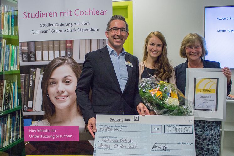 Die Studentin Katharina Vollrodt (25) ist die Gewinnerin des Cochlear Graeme Clark Stipendiums 2017. Mit dem Stipendium ehrt Cochlear, Weltmarktführer für Hörimplantate, hörgeschädigte Studierende, die mit einem Cochlear Nucleus Cochlea-Implantat (CI) System hören, gute Leistungen vorweisen können und sich ehrenamtlich engagieren.