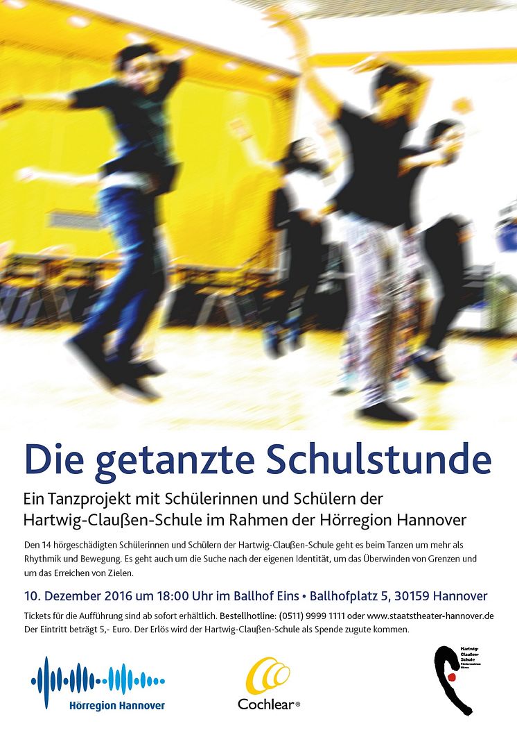 Seit Beginn des Schuljahres proben Jungen und Mädchen der Hartwig-Claußen-Schule (HCS), dem einzigen Förderzentrum mit dem Schwerpunkt Hören der Region Hannover, in einer Tanz AG das Stück „Die getanzte Schulstunde“. Unter der Leitung von Profitänzer Ole Driever studieren Sie seit August die Choreographie ein.