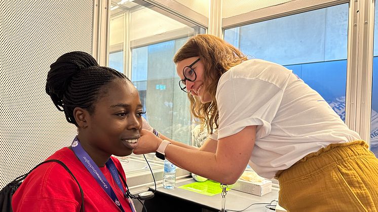Die beigefügte Pressefoto dürfen Sie im Zusammenhang mit unserer Meldung frei verwenden. Bildunterschrift: „Hier dabei zu sein, war ein tolles Erlebnis“ – Hörakustikerin Carmen Armbruster, Account Managerin Acousticians, überprüft das Gehör einer Teilnehmerin aus Mosambik (Foto: Cochlear Ltd.)